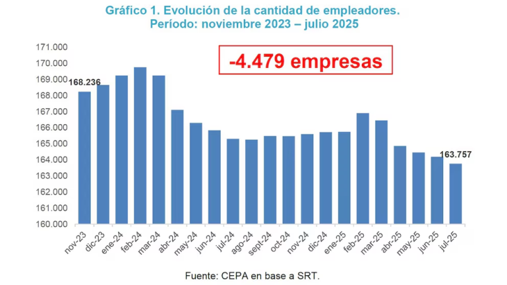 El informe muestra que 4.479 empleadores desaparecieron, lo que equivale a una caída del 2,7%. Los sectores más afectados fueron Construcción, Industria manufacturera y Comercio, con reducciones de hasta 755 empleadores en Construcción y 743 en Manufactura. Otros rubros, como Servicios inmobiliarios y Transporte, también sufrieron bajas importantes.