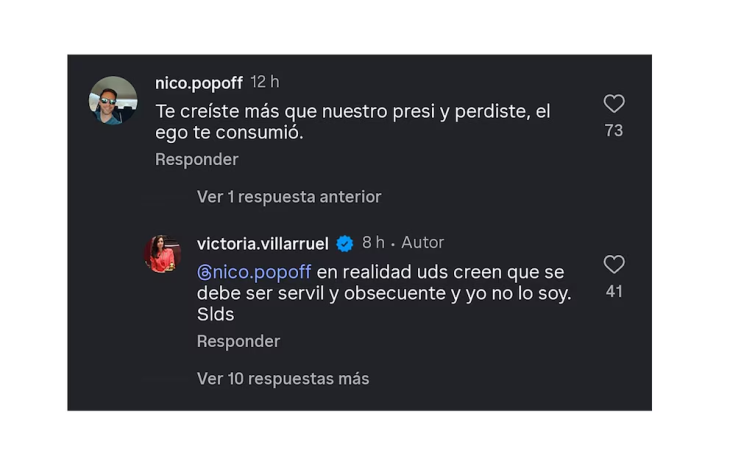 Cuando otro usuario le sugirió dedicarse a otra cosa, contestó tajante: “Porque en esta soy muy buena. Y decente, una condición en extinción”. También tuvo respuesta para quienes la acusan de enfrentarse a Milei: “Ustedes creen que se debe ser servil y obsecuente, y yo no lo soy”.