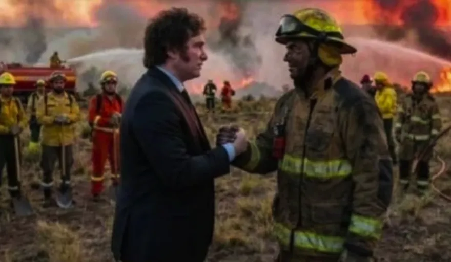 Del otro lado, Milei quedó en el centro de la polémica tras publicar una imagen trucada: aparece de traje, en medio de un incendio, dándole la mano a un bombero, mientras otros brigadistas observan la escena sin combatir el fuego. La foto, creada con herramientas de Inteligencia Artificial, fue rápidamente cuestionada por usuarios y especialistas.