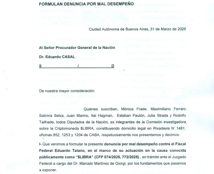 La presentación fue dirigida al procurador general interino Eduardo Casal y lleva la firma de legisladores de distintos espacios políticos, entre ellos Mónica Frade, Maximiliano Ferraro, Sabrina Selva, Juan Marino, Itai Hagman, Esteban Paulón, Julia Strada y Rodolfo Tailhade.