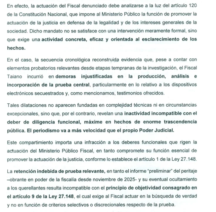 Para los firmantes, esto refuerza la hipótesis de un desempeño irregular por parte del fiscal, al que acusan de mantener una “inactividad incompatible” con sus funciones.