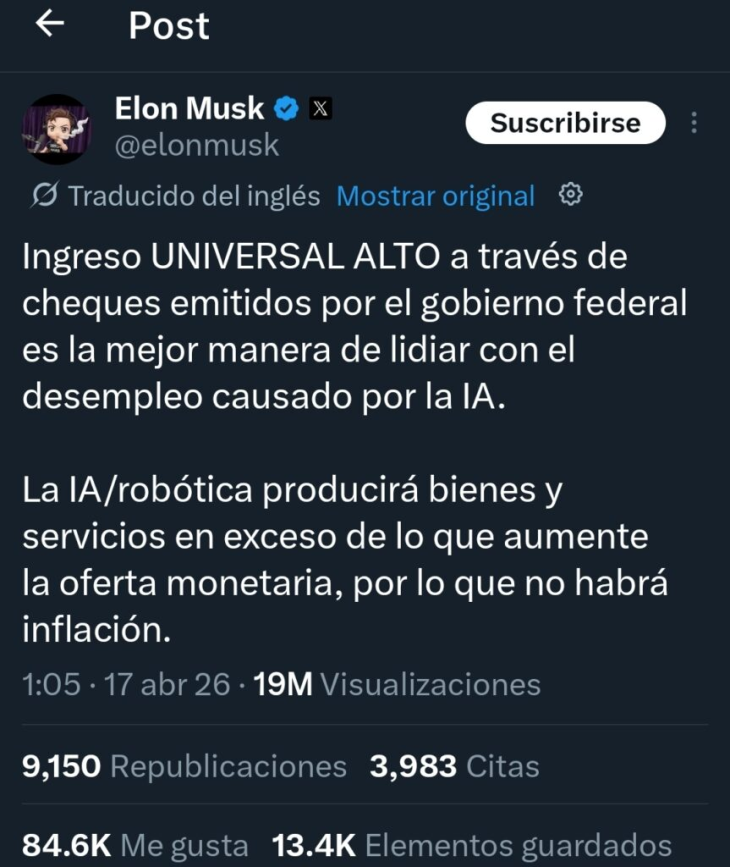 El avance de la inteligencia artificial volvió a poner en discusión uno de los temas más sensibles de la economía moderna: qué ocurrirá con el trabajo humano si las máquinas reemplazan millones de empleos. En ese contexto, Elon Musk sorprendió con una definición que generó ruido dentro del propio universo liberal: sostuvo que los Estados deberían garantizar un ingreso universal alto para sostener el consumo y la estabilidad social.