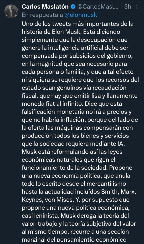 Las declaraciones rápidamente encontraron eco en la Argentina. El analista financiero Carlos Maslatón interpretó el planteo como un cambio histórico dentro del capitalismo contemporáneo y lo definió como una señal de que el mercado dejaría de ser el principal mecanismo de distribución de ingresos.